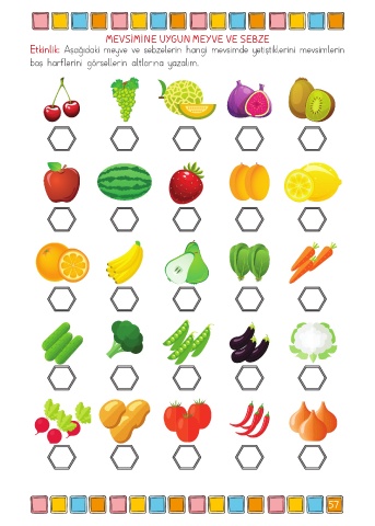 MEVSİMİNE UYGUN MEYVE VE SEBZE Etkinlik: Aşağıdaki meyve ve sebzelerin hangi mevsimde yetiştiklerini mevsimlerin baş harflerini görsellerin altlarına yazalım. 57