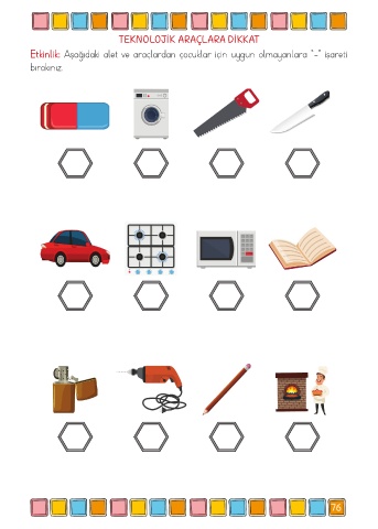 TEKNOLOJİK ARAÇLARA DİKKAT Etkinlik: Aşağıdaki alet ve araçlardan çocuklar için uygun olmayanlara “-“ işareti bırakınız. 76