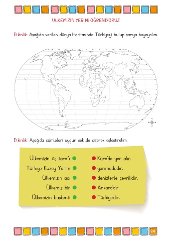 Etkinlik: Aşağıda verilen dünya Haritasında Türkiye’yi bulup sarıya boyayalım.