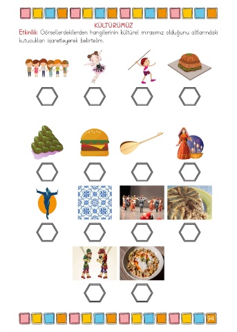 KÜLTÜRÜMÜZ Etkinlik: Görsellerdekilerden hangilerinin kültürel mirasımız olduğunu altlarındaki kutucukları işaretleyerek belirtelim. 94