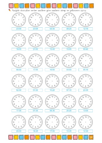 Aşağıda okunuşları verilen saatlere göre saatlerin akrep ve yelkovanını çiziniz.