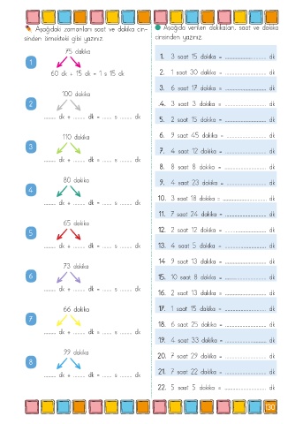 ......... dk + ......... dk = ....... s ......... dk 5. 2 saat 15 dakika = ............................... dk