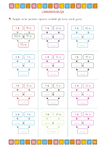 Aşağıda verilen paraların toplamını örnekteki gibi kuruş olarak yazınız.