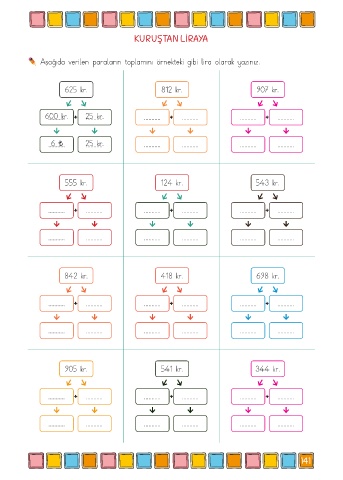 Aşağıda verilen paraların toplamını örnekteki gibi lira olarak yazınız.