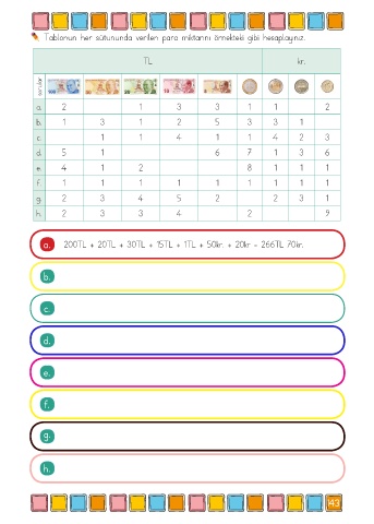 Tablonun her sütununda verilen para miktarını örnekteki gibi hesaplayınız.