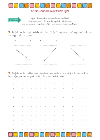 tane doğru parçası ve yeşik renkli 3 tane ışın modeli çiziniz.