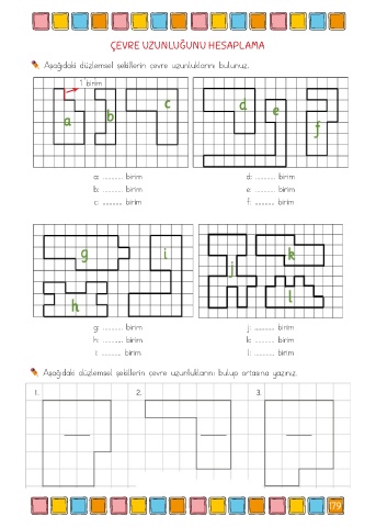 Aşağıdaki düzlemsel şekillerin çevre uzunluklarını bulup ortasına yazınız.