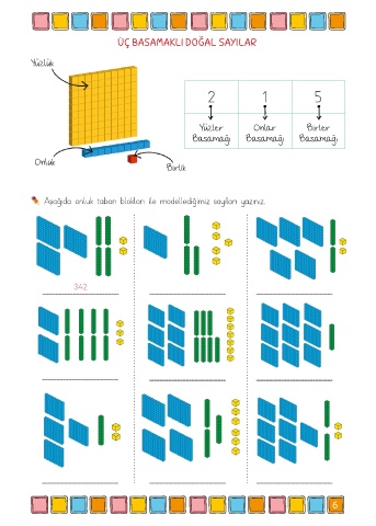 ÜÇ BASAMAKLI DOĞAL SAYILAR Yüzlük 2 1 5 Yüzler Onlar Birler Basamağı Basamağı Basamağı Onluk Birlik Aşağıda onluk taban blokları ile modellediğimiz sayıları yazınız. 342 6