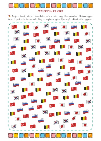 OTELDE KİMLER VAR? Aşağıda Antalya’da bir otelde kalan müşterilerin hangi ülke vatandaşı olduklarını gös- teren bayraklar bulunmaktadır. Bayrak sayılarına göre diğer sayfadaki etkinlikleri yapınız. 77