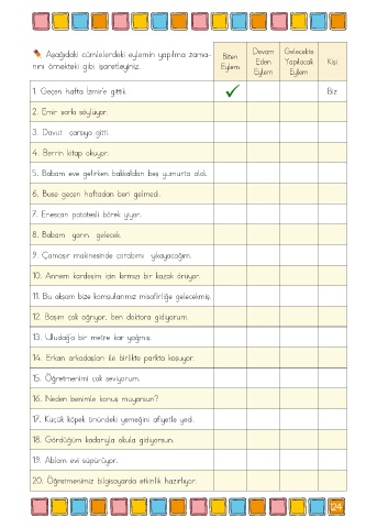 Aşağıdaki cümlelerdeki eylemin yapılma zama- Biten Devam Gelecekte