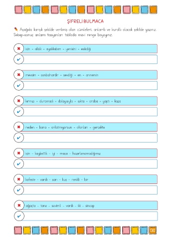 Sebep-sonuç anlamı taşıyanları tabloda mavi renge boyayınız.