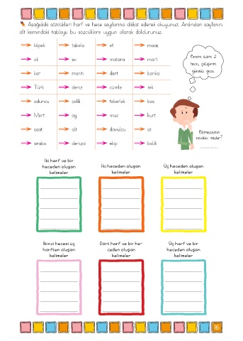 Aşağıdaki sözcükleri harf ve hece sayılarına dikkat ederek okuyunuz. Ardından sayfanın