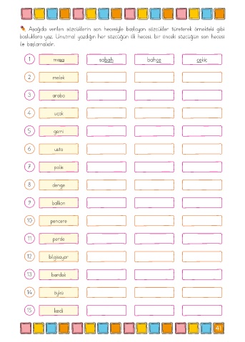 boşluklara yaz. Unutma! yazdığın her sözcüğün ilk hecesi, bir önceki sözcüğün son hecesi