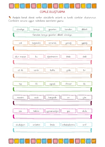 Aşağıda karışık olarak verilen sözcüklerle anlamlı ve kurallı cümleler oluşturunuz.