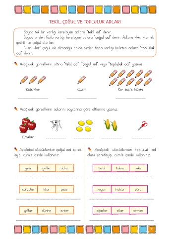 Aşağıdaki görsellerin altına “tekil ad”, “çoğul ad” veya “topluluk adı” yazınız.