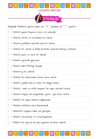 Aşağıdaki ifadelerin yanına doğru ise “ D ”, yanlışsa da “ Y ” yazalım.