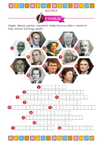 BULMACA Etkinlik Aşağıda ülkemize yaptıkları çalışmalarla katkıda bulunmuş kişilerin resimlerine bakıp isimlerini bulmacaya yazalım. 1 2 3 4 5 6 7 8 9 10 11 12 1 2 3 4 5 6 7 8 9 10 11 12 100