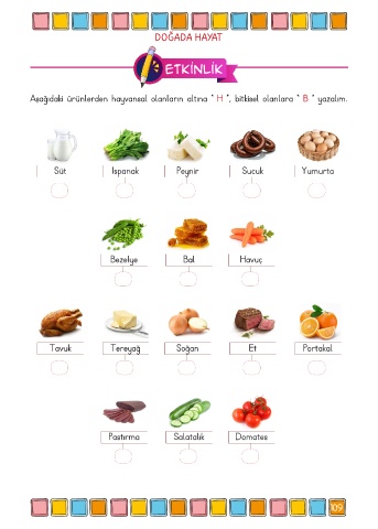 DOĞADA HAYAT Etkinlik Aşağıdaki ürünlerden hayvansal olanların altına “ H ”, bitkisel olanlara “ B ” yazalım. Süt Ispanak Peynir Sucuk Yumurta Bezelye Bal Havuç Tavuk Tereyağ Soğan Et Portakal Pastırma Salatalık Domates 109