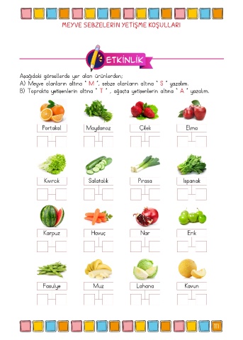 A) Meyve olanların altına “ M ”, sebze olanların altına “ S ” yazalım.