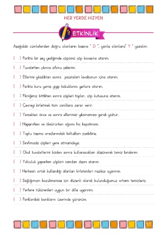 Aşağıdaki cümlelerden doğru olanların başına “ D ”, yanlış olanlara“ Y ” yazalım.