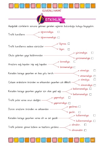 Aşağıdaki cümlelerin sonuna gelmesi gereken eylemin bulunduğu kutuyu boyayalım.