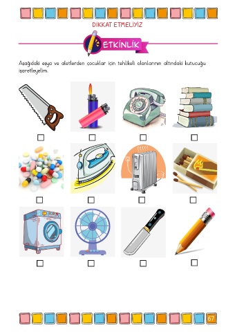 DİKKAT ETMELİYİZ Etkinlik Aşağıdaki eşya ve aletlerden çocuklar için tehlikeli olanlarının altındaki kutucuğu işaretleyelim. etmemeliyiz. kullanmamalıyız. 67