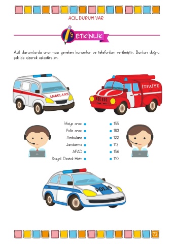 ACİL DURUM VAR Etkinlik Acil durumlarda aranması gereken kurumlar ve telefonları verilmiştir. Bunları doğru şekilde çizerek eşleştirelim. İtfaiye aracı 155 Polis aracı 183 Ambulans 122 Jandarma 112 AFAD 156 Sosyal Destek Hattı 110 73