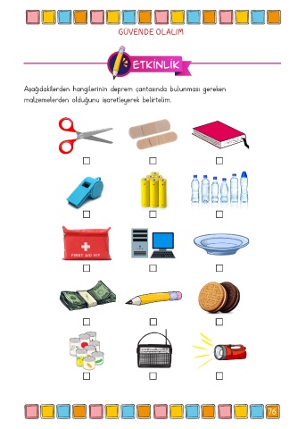 GÜVENDE OLALIM Etkinlik Aşağıdakilerden hangilerinin deprem çantasında bulunması gereken malzemelerden olduğunu işaretleyerek belirtelim. 76