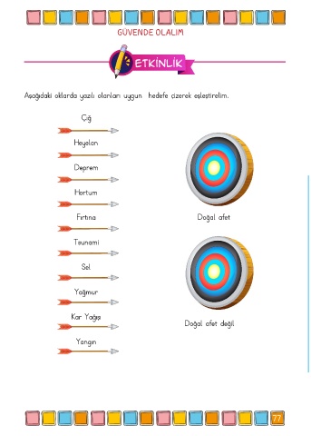 GÜVENDE OLALIM Etkinlik Aşağıdaki oklarda yazılı olanları uygun hedefe çizerek eşleştirelim. Çığ Heyelan Deprem Hortum Fırtına Doğal afet Tsunami Sel Yağmur Kar Yağışı Doğal afet değil Yangın 77