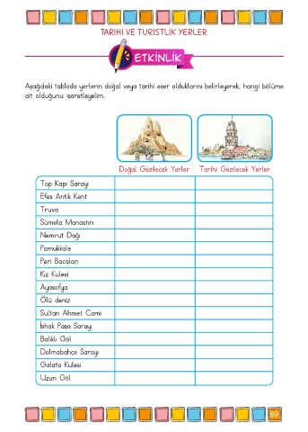 Aşağıdaki cümlelerden doğru olanların başına “ D ”, Aşağıdaki tabloda yerlerin doğal veya tarihi eser olduklarını belirleyerek, hangi bölüme