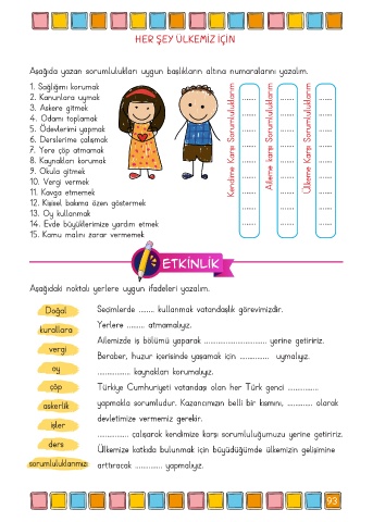 Aşağıda yazan sorumlulukları uygun başlıkların altına numaralarını yazalım.
