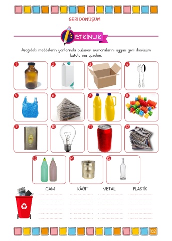 GERİ DÖNÜŞÜM Etkinlik Aşağıdaki maddelerin yanlarında bulunan numaralarını uygun geri dönüşüm kutularına yazalım. 1 2 3 4 5 6 7 8 9 10 11 12 13 14 15 CAM KÂĞIT METAL PLASTİK 102