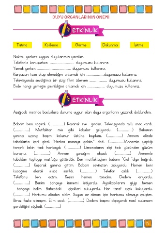 Aşağıdaki metinde boşluklara duruma uygun olan duyu organlarını yazarak dolduralım.