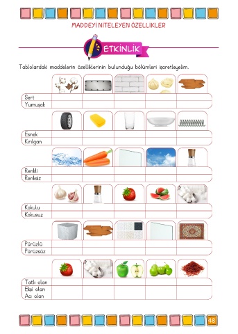 MADDEYİ NİTELEYEN ÖZELLİKLER Etkinlik Tablolardaki maddelerin özelliklerinin bulunduğu bölümleri işaretleyelim. Sert Yumuşak Esnek Kırılgan Renkli Renksiz Kokulu Kokusuz Pürüzlü Pürüzsüz Tatlı olan Ekşi olan Acı olan 48