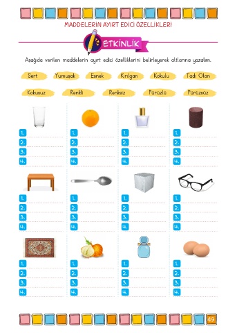Aşağıda verilen maddelerin ayırt edici özelliklerini belirleyerek altlarına yazalım.