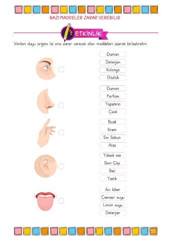 Verilen duyu organı ile ona zarar verecek olan maddeleri çizerek birleştirelim.