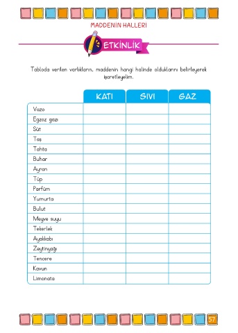 Tabloda verilen varlıkların, maddenin hangi halinde olduklarını belirleyerek