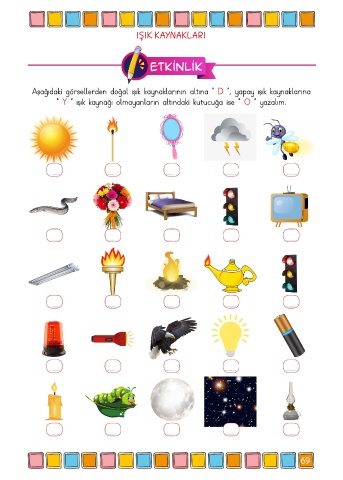 IŞIK KAYNAKLARI Etkinlik Aşağıdaki görsellerden doğal ışık kaynaklarının altına “ D ”, yapay ışık kaynaklarına “ Y ” ışık kaynağı olmayanların altındaki kutucuğa ise “ O ” yazalım. 69