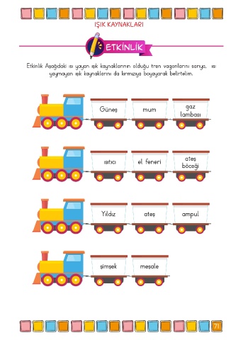 Etkinlik Aşağıdaki ısı yayan ışık kaynaklarının olduğu tren vagonlarını sarıya, ısı
