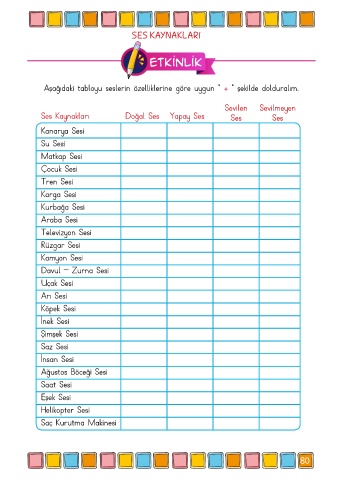 Aşağıdaki tabloyu seslerin özelliklerine göre uygun “ + “ şekilde dolduralım.