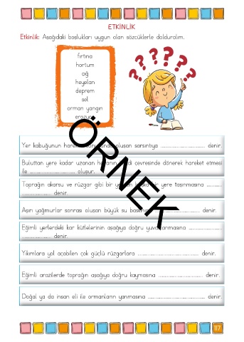 ETKİNLİK Etkinlik: Aşağıdaki boşlukları uygun olan sözcüklerle dolduralım. fırtına hortum çığ heyelan deprem sel orman yangın erozyon ÖRNEK 117