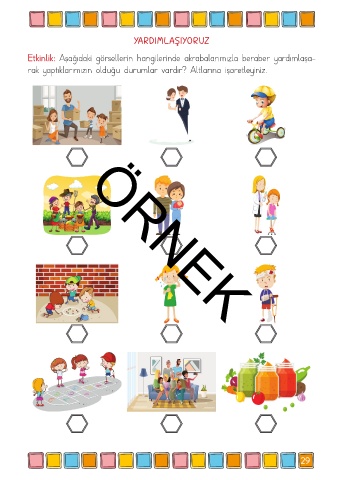 YARDIMLAŞIYORUZ Etkinlik: Aşağıdaki görsellerin hangilerinde akrabalarımızla beraber yardımlaşa- rak yaptıklarımızın olduğu durumlar vardır? Altlarına işaretleyiniz. ÖRNEK 29