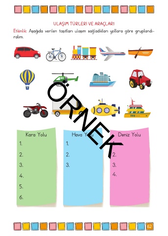 ULAŞIM TÜRLERİ VE ARAÇLARI Etkinlik: Aşağıda verilen taşıtları ulaşım sağladıkları yollara göre gruplandı- ralım. Kara Yolu Hava Yolu Deniz Yolu ÖRNEK 1. 1. 1. 2. 2. 2. 3. 3. 3. 4. 4. 5. 6. 62