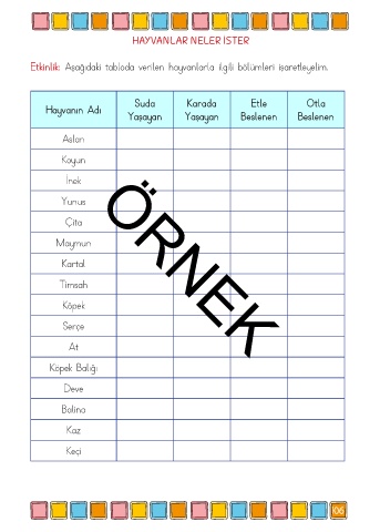 Etkinlik: Aşağıdaki tabloda verilen hayvanlarla ilgili bölümleri işaretleyelim.