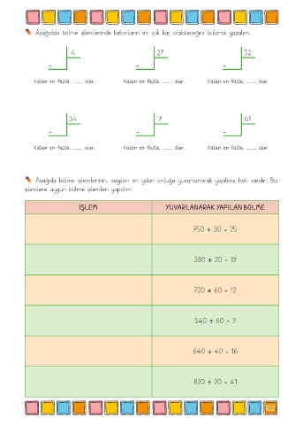 Kalan en fazla .......... olur. Kalan en fazla .......... olur. Kalan en fazla .......... olur.