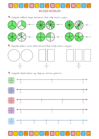 Aşağıdaki şekillerin verilen bileşik kesirlerde ifade edildiği kadarını boyayınız.