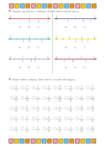 Aşağıdaki sayı doğrularını inceleyiniz. Harflerle belirtilen kesirleri yazınız.