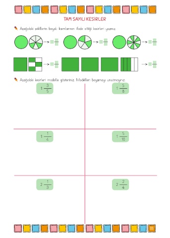 TAM SAYILI KESİRLER Aşağıdaki şekillerin boyalı kısımlarının ifade ettiği kesirleri yazınız. Aşağıdaki kesirleri modelle gösteriniz. Modelleri boyamayı unutmayınız. 3 5 1 1 5 8 1 5 1 1 4 10 1 2 2 2 3 4 111