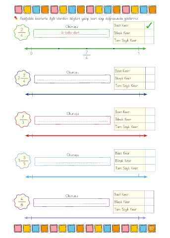 Aşağıdaki kesirlerle ilgili istenilen bilgileri yazıp kesri sayı doğrusunda gösteriniz.
