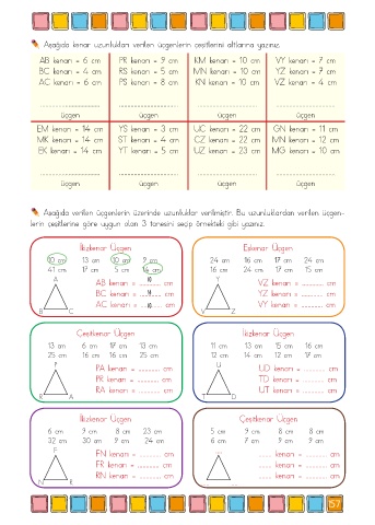 Aşağıda kenar uzunlukları verilen üçgenlerin çeşitlerini altlarına yazınız.